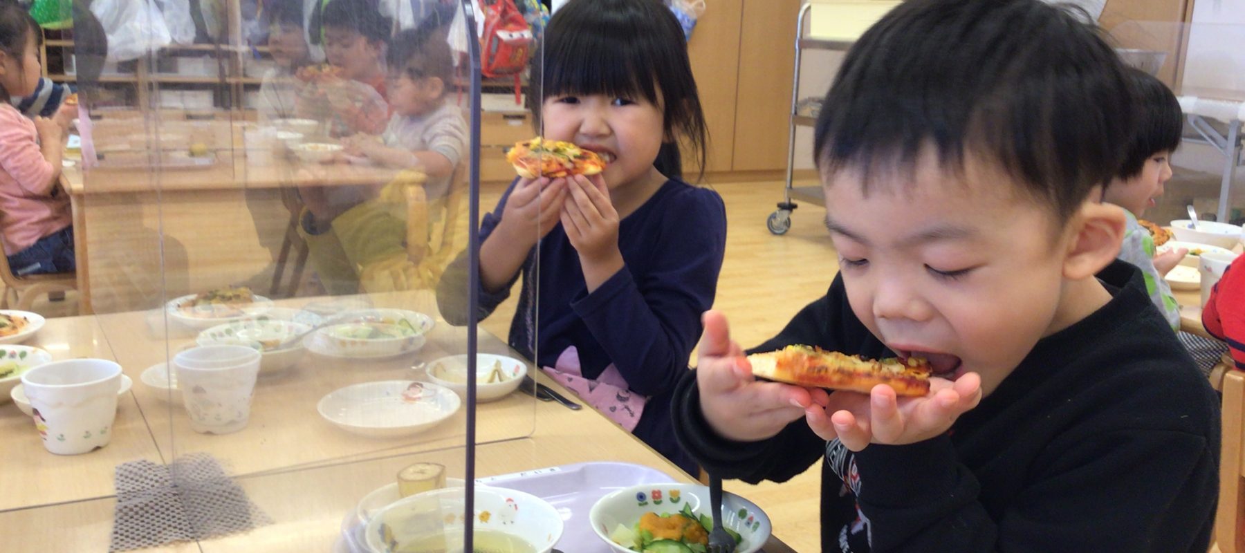 嬉しそうに教えてくれました!焼き上がりを待ち、給食で自分が作ったピザを食べると「おいしい!」ととても喜んでいました。