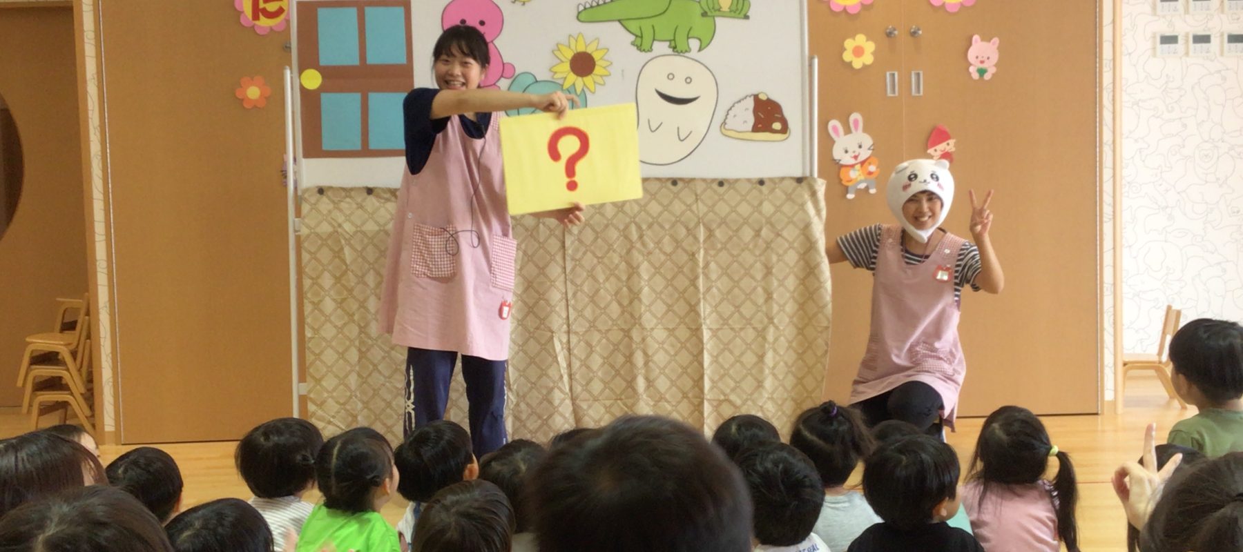 全員でハッピーフレンズを歌った後は、先生からの出し物「ミラクルレンジ」のパネルシアターを見ました。動物たちの持って来てくれたプレゼントをミラクルレンジの中に入れてクルクル回すといろいろな物に大変身!最後にプレゼントを持って来てくれたのはちいかわに変身した先生!先生のプレゼントの中身を見るて変身する物が分かった子ども達は「ケーキ!ケーキ!」と手拍子をしてくれました。最後はみんなでケーキを食べました。