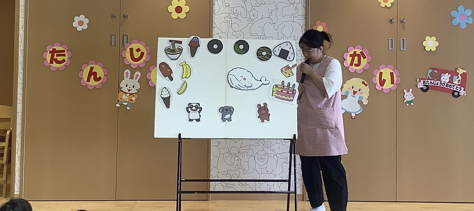 今日は、10月生まれのお誕生日会があり、前回の誕生日会の時にお休みしていた子を含めると14名のお友達に名前を聞いたり、好きな食べ物や遊びなどの質問をしました。緊張しながらも元気に答えてくれました。保育士の出し物では「モクモクくものレストラン」のパネルシアターを見ました。色々な雲の形がきて「これはなんだ?」と聞くと「〇〇」と元気に答えたり、答えを聞いて合っていると喜んでいました。