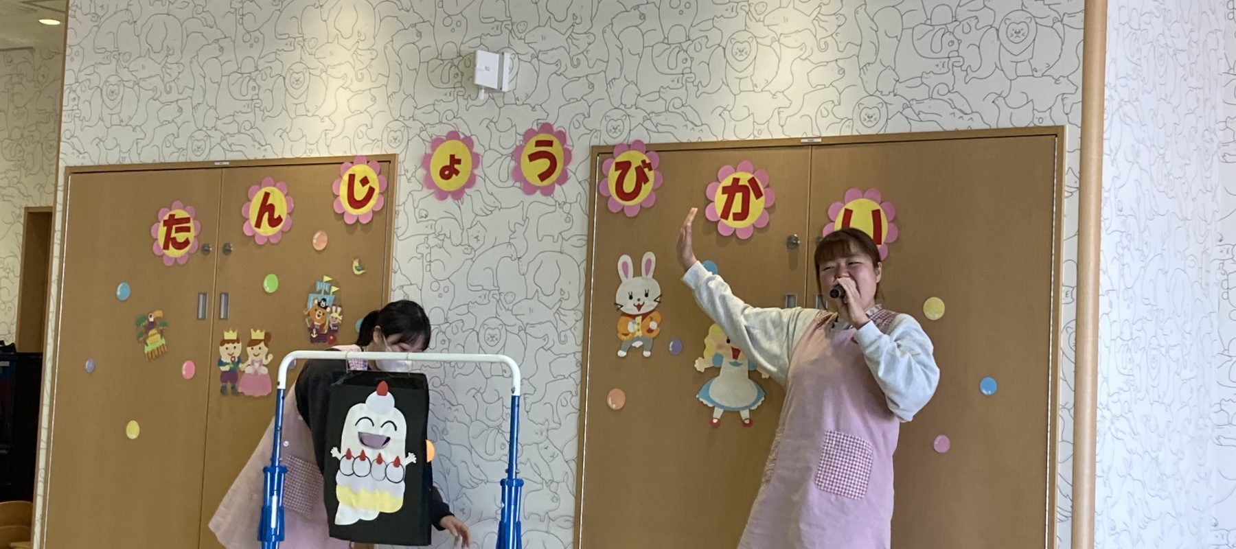 職員の出し物では知っている人も多い「ばけたくん」をやりました。「しってる~!」「あはは!」など次々出てくる食べ物にばけたくんは