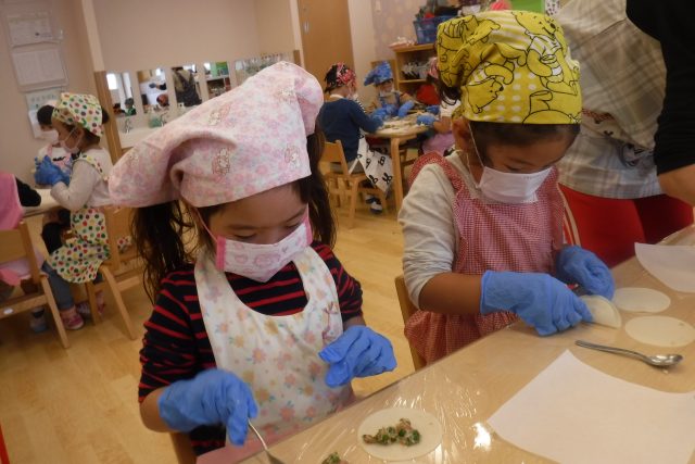 まずは、よく手を洗って、エプロン装着。身支度ができたら、材料をボールでまぜまぜこねて、皮で包みました。普段からおうちでお手伝いしている子が多いようで、ちゃんとひだを作ろうとしたり、最後にトントンとして底を作るなんてことも知っていました。