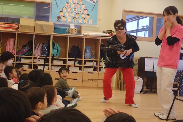 11月21日に2歳児から5歳児クラスを対象に風邪予防集会を行いました。ばい菌はみんなの周りにたくさんいること、ばい菌をお友達の方へ飛ばさないように咳やくしゃみが出るときはマスクをしたり、口を肘で覆うことなどをクイズをまじえ、お話しました。途中、かぜばい菌も登場!手洗い攻撃や咳エチケットのポーズをしたり、ばい菌に負けない強い体になるための3つのお約束をし、みんなで力を合わせてかぜばい菌をやっつけることができました。最後は「もしもしかめよ」の音楽に合わせて、みんなで楽しく歌いながら、手洗いの練習をしました。これから風邪をひきやすい季節。好き嫌いせずご飯をしっかり食べて、よく寝て、お外でたくさん遊び、ばい菌に負けない強い体になろうね!