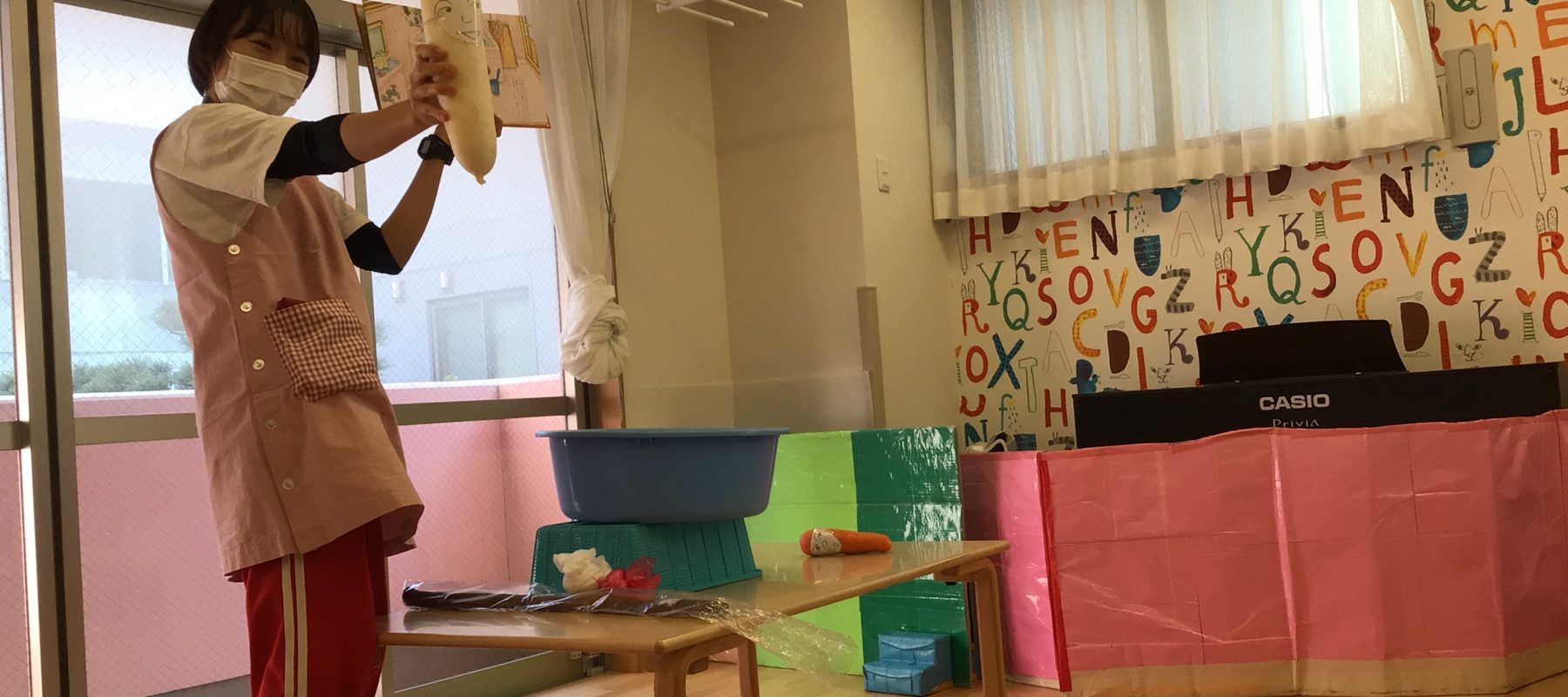 お風呂に入る場面ではたらいに水が張ってあり、子ども達も楽しんでみていました。最後に野菜達からのメッセージで、「僕たちを美味しく食べてね。」と言われ、