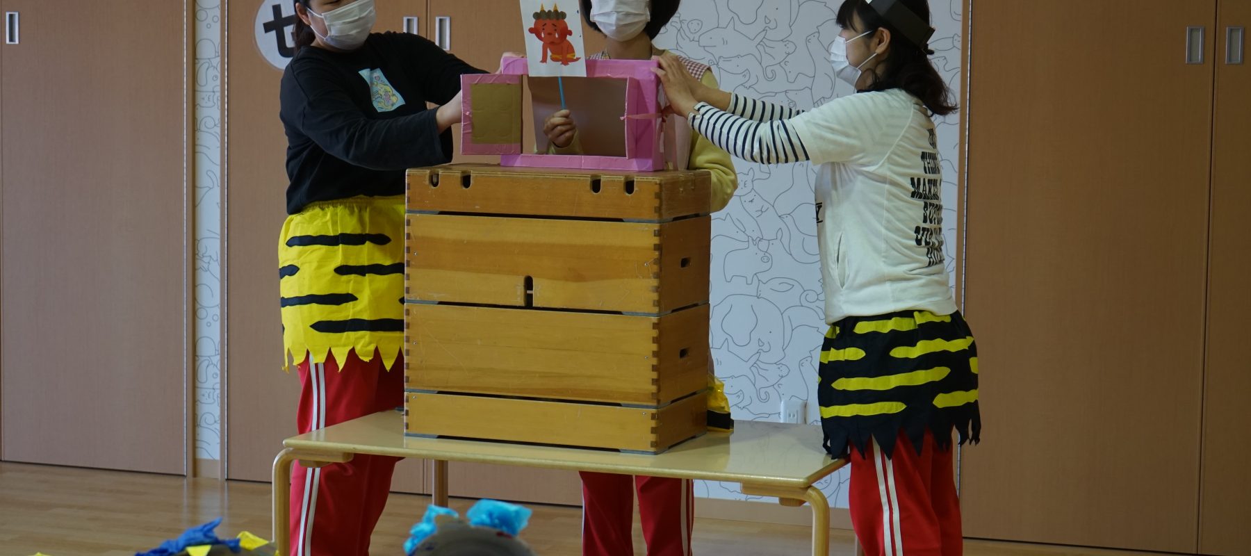 今日は節分がありました。0歳、1歳は豆まきの手遊びや鬼のパンツの絵本を見たり、最後は一緒に踊って楽しみました。2歳、3歳、4歳、5歳は、みんなの心の中にいる鬼はどんな鬼なのか、先生の心の中にも鬼はいるのか覗いてみようといつもとは違った節分を行いました。先生の中にいる鬼を「鬼はそと!福はうち!」と言って鬼退治を頑張ってくれました!その後は各クラスに戻り、鬼のゲームを楽しみました!