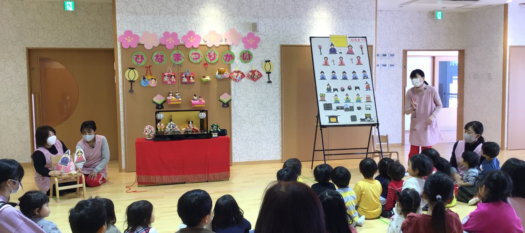 今日はホールでひな祭り会を行いました。ひな祭りのパネルシアターや、ペープサートを使った劇では、皆、興味津々で見ていました。また各クラスで、ひな祭りのカードを探す宝探しゲームを行いました。子ども達はカードを見つけると「見て~あった!」と目を輝かせて嬉しそうに見せてくれました。お昼は錦糸卵や絹さやで飾ってあるいなり寿司でした。みんな喜んで食べていました。