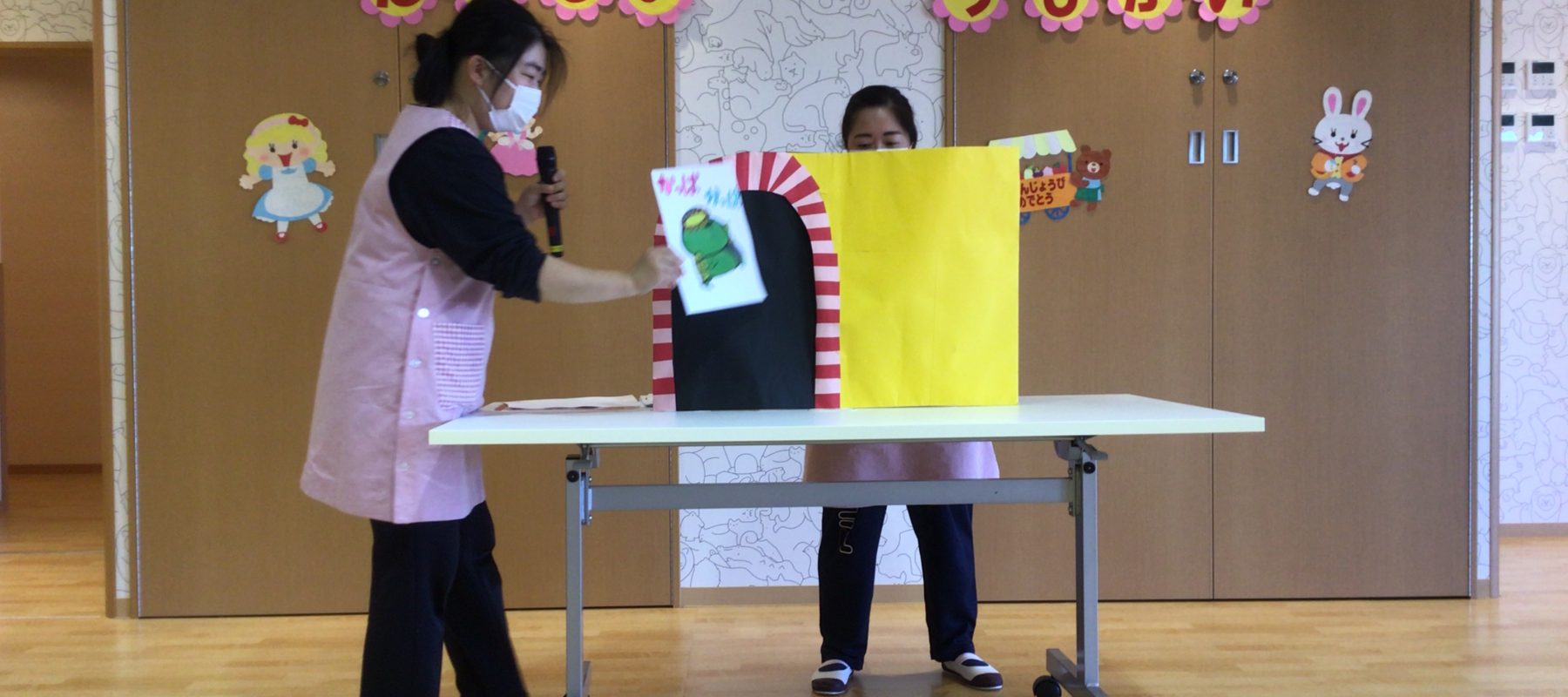 今日は、11月生まれのお誕生日会があり、13名のお友達をお祝いしました。名前を呼ばれると元気に返事をして前に出てきてくれました。インタビューでは、緊張をしながらも、質問に答えたり、名前を言うことが出来ました。先生たちの出し物では「へんしんトンネル」を見ました。みんなで一緒に言ったり、変わって出てきたものを不思議そうに見ていました。