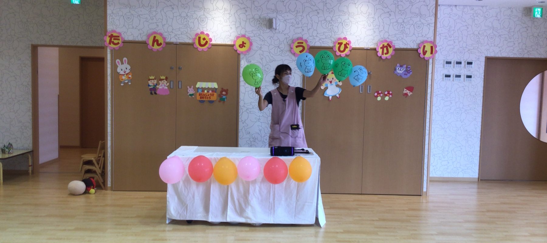 6月22日(水)は6月生まれのお友だちのお誕生日会でした。前に出て冠をもらったり歌を歌ってもらったりして嬉しそうにしていました!先生からの出し物では「風船シアター」かえるやかたつむりを風船に描き「かえるのうた」と「かたつむり」を一緒に歌いました。「ぼく、かえるのうた大好きだよ!」と笑顔で話していました!