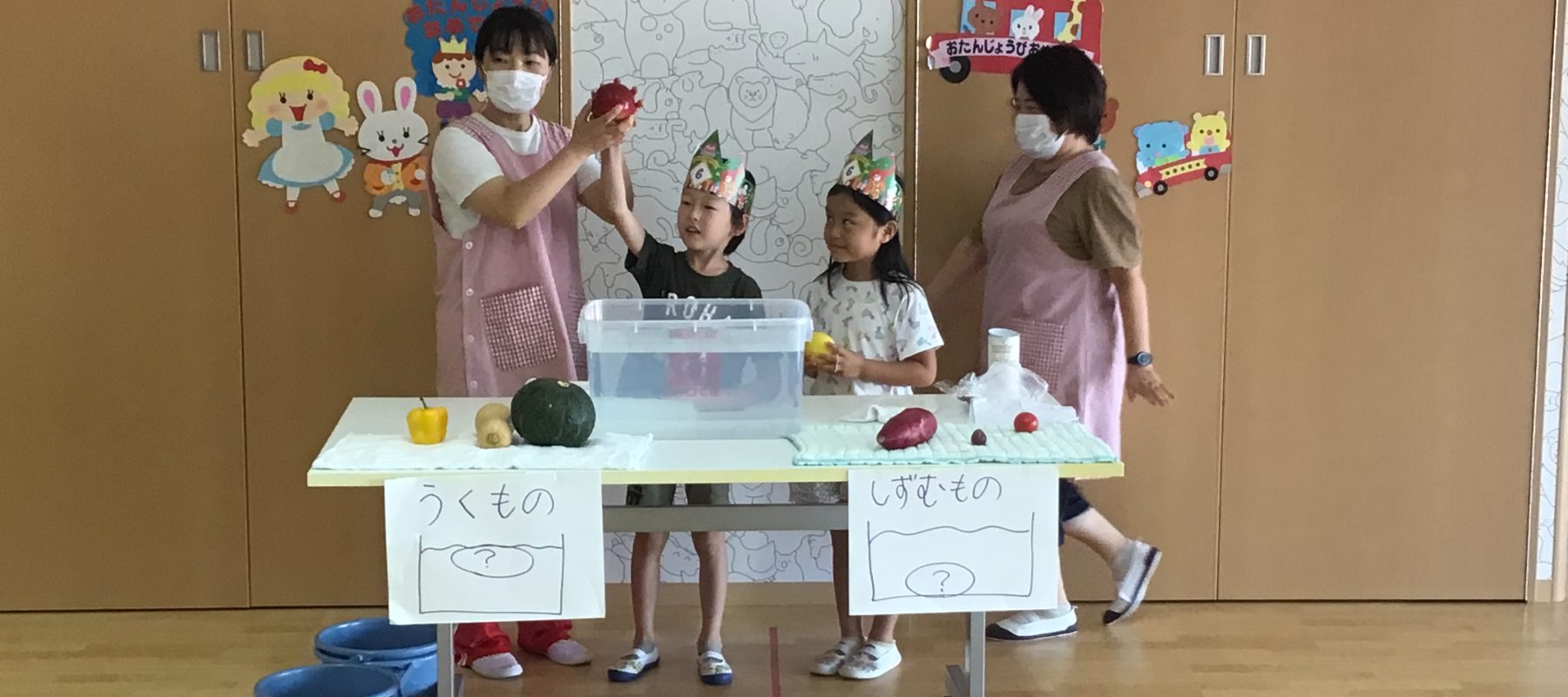 今日は9月生まれのお友達のお誕生日会がありました。1歳児クラスのお友達はみんなの前に出て、緊張する可愛らしい様子も見られましたが、2歳児クラスの子は名前や聞かれた質問にも答えていました。幼児組さんになると堂々とした姿でしっかりみんなに伝える事ができていて、成長を感じました。保育士からの出し物は、「収穫の秋」ということで、野菜のクイズや食べ物が浮くか沈むかの実験を見ました。食べ物という事もあり、とても興味津々でした。