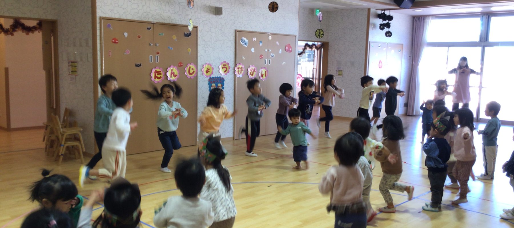 今月の誕生日会はダンスパーティ🎉ひまわり組・ゆり組のヒップホップダンスや、職員のきつねダンス、最後はみんなでソーシャルディスダンスを楽しみました。