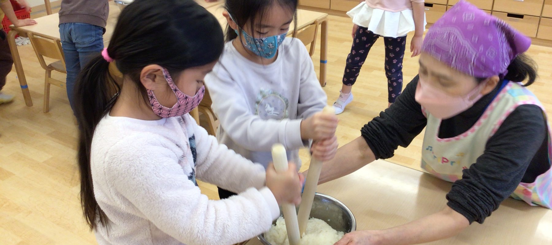 5歳児クラスがお正月に向けて鏡餅作りを行いました。まずは朝に米研ぎを行いました。もち米に触れたり匂いを嗅いだりと観察をしてから一人ずつ米研ぎを行いました。「お家でもやったことあるよ!」と上手に洗っていました。もち米を形成機でふかし、もち米の良い香りがしてくると子どもたちもますます楽しみな様子でした。ふかしたもち米は一人一口味見してみました。「いい匂いがする!」「美味しい!」と様々な声があがりました。そのあとは2グループに分かれて鏡餅の上段、下段の餅作りを行いました。臼と杵に見立てたボウルとすりこぎで餅つきのスタートです。力いっぱいついていくと段々と粘り気が出てきて、もち米の変化に気づく子どもたち。最後に丸く形作りを行いました。子どもたちには紙芝居で鏡餅を飾る理由を伝えています。「家族が仲良く過ごせますように」「1年みんなが幸せに暮らせますように」という願いを込めながら作りました。完成した鏡餅は、保育園の玄関に飾ります。