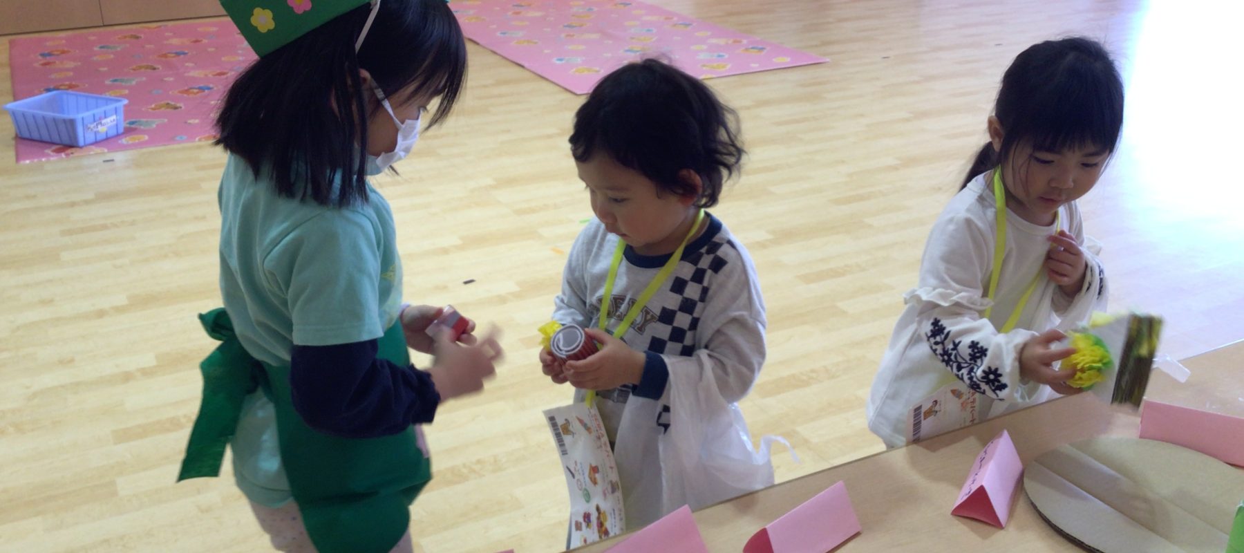 今日は乳児組がお客さん、ひまわり組が店員でお店屋さんごっこをしました。ひまわり組の店員も買いに来たお客さんもちょっぴり緊張している様子が見られましたが、乳児組さんの可愛らしい姿を見て「どれにする?」「すきなのえらんでいいよ。」と優しく声を掛けていました。指差しで伝えると袋の中に入れてあげたりする姿も見られました。選んだ商品を手渡しでもらっている子もいて、満面の笑みで握りしめる嬉しそうな姿もありました。