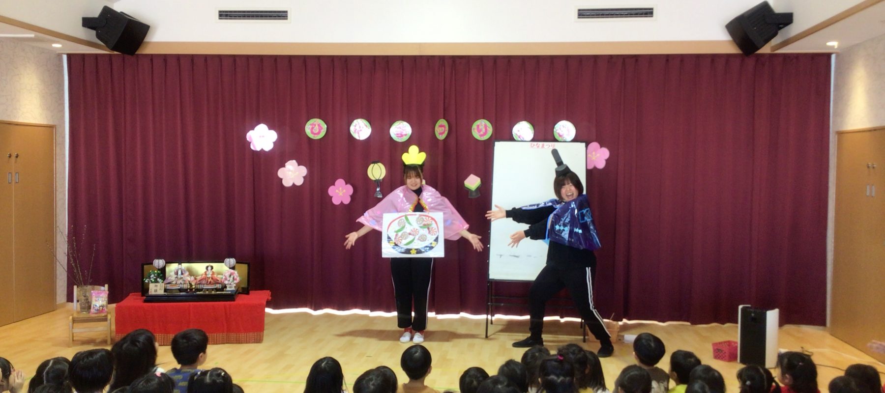今日は、ひなまつり集会がありました。クイズやパネルシアター『七段飾り』やペープサート『ちらしずしクッキング』を見て楽しみました。