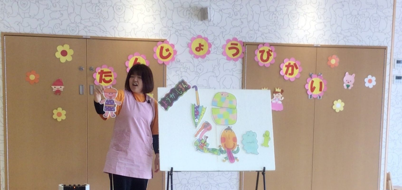 今日は4月のお誕生日会がありました。お誕生日インタビューから始まり、全員でハッピーフレンズを歌った後に先生からの出し物で「妖怪じーまん」のパネルシアターを見ました。色んな妖怪が出てきて、歌のフレーズが同じなので覚えやすく、子ども達も覚えて歌っている姿も見られました。妖怪の中で誰が1番なのかと途中で言い合いをする場面もありましたが、ざしきわらしのぼっこのアイディアで、妖怪たちも仲直りして結局みんなが1番だねとハッピーな話で終わりました。歌の印象が強く、誕生日会終了後にも口ずさんで歌っている子もいました。