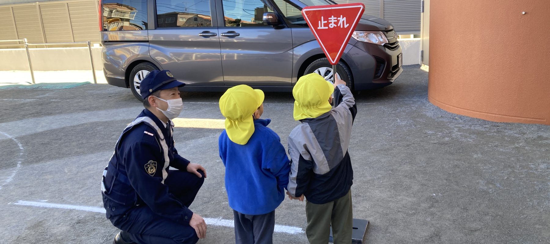 最後に、お巡りさんの話やDVDの内容を踏まえて実際に園庭に出て歩行訓練をやりました。
