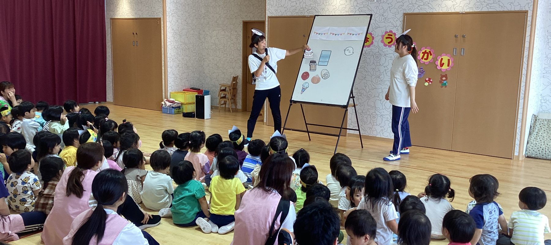 今日は5月生まれのお誕生日会でした。入園、進級してから一ヶ月が経ち少しずつ園生活に慣れたのか落ち着いた雰囲気で参加してくれました。5月生まれの子に名前と好きな食べ物を聞くとどの子も自信満々で発表してくれて驚きました。先生からは「くいしんぼう おばけ」のパネルシアターの出し物でプレゼント!終わった後子ども達から「楽しかったー。またやってね」と嬉しい言葉をもらいました。楽しい時間となったようで良かったです。