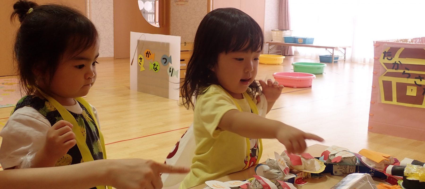 今年のお店屋さんは、ミニカーやさん(すみれ組)・お花屋さん(ゆり組)・おすしやさん(ひまわり組)・さかなつり・宝探しゲーム・ジュース屋さんの6店舗です。