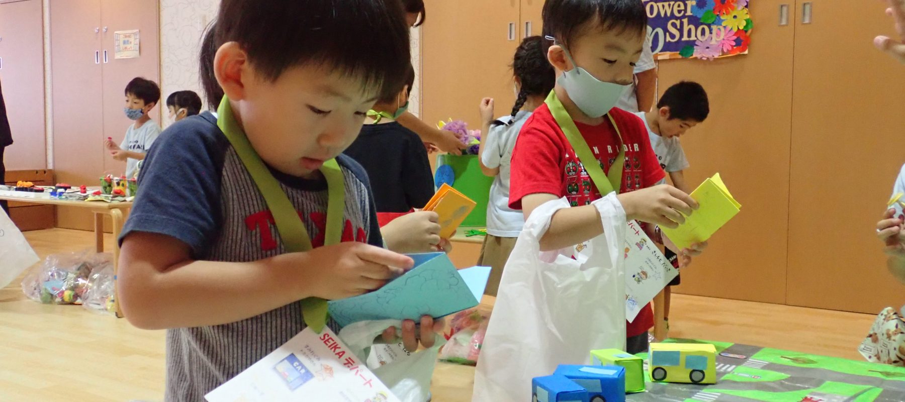 2日目は幼児クラスの子のお買い物の日。一日目と同じくミニカーやさん(すみれ組)・お花屋さん(ゆり組)・おすしやさん(ひまわり組)・さかなつり・宝探しゲーム・ジュース屋さんの6店舗です。2日目もひまわり組のお友達が店員さんをやってくれました。「これ下さーい!」「お金です。」と上手にお買い物をすることができ、中にはお友達と相談しながら買う物を決めている子もいました。